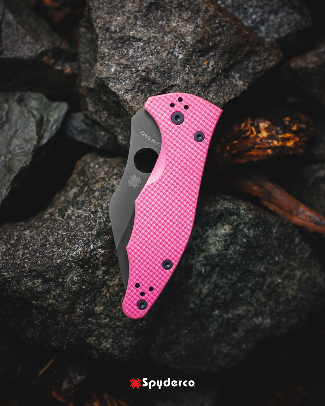 Bei dieser limitierten Auflage ist die Klinge aus CPM® S30V® mit einer schwarzen DLC-Beschichtung (Diamond-Like Carbon) überzogen und mit einem Griff aus pinken G-10-Schalen mit Peel-Ply-Struktur kombiniert. Um das Design abzurunden, ist auch der Liner, der Clip und die Schrauben schwarz beschichtet.