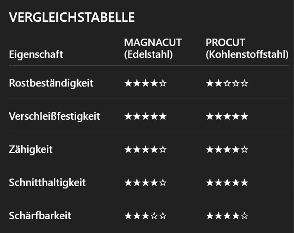 Biegefestigkeit sowie Schärfe und Schnitthaltigkeit.