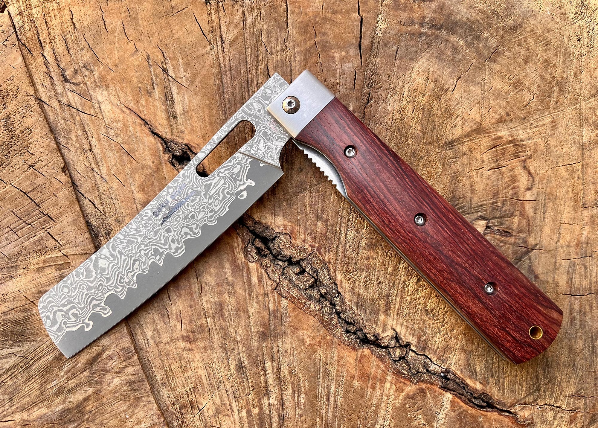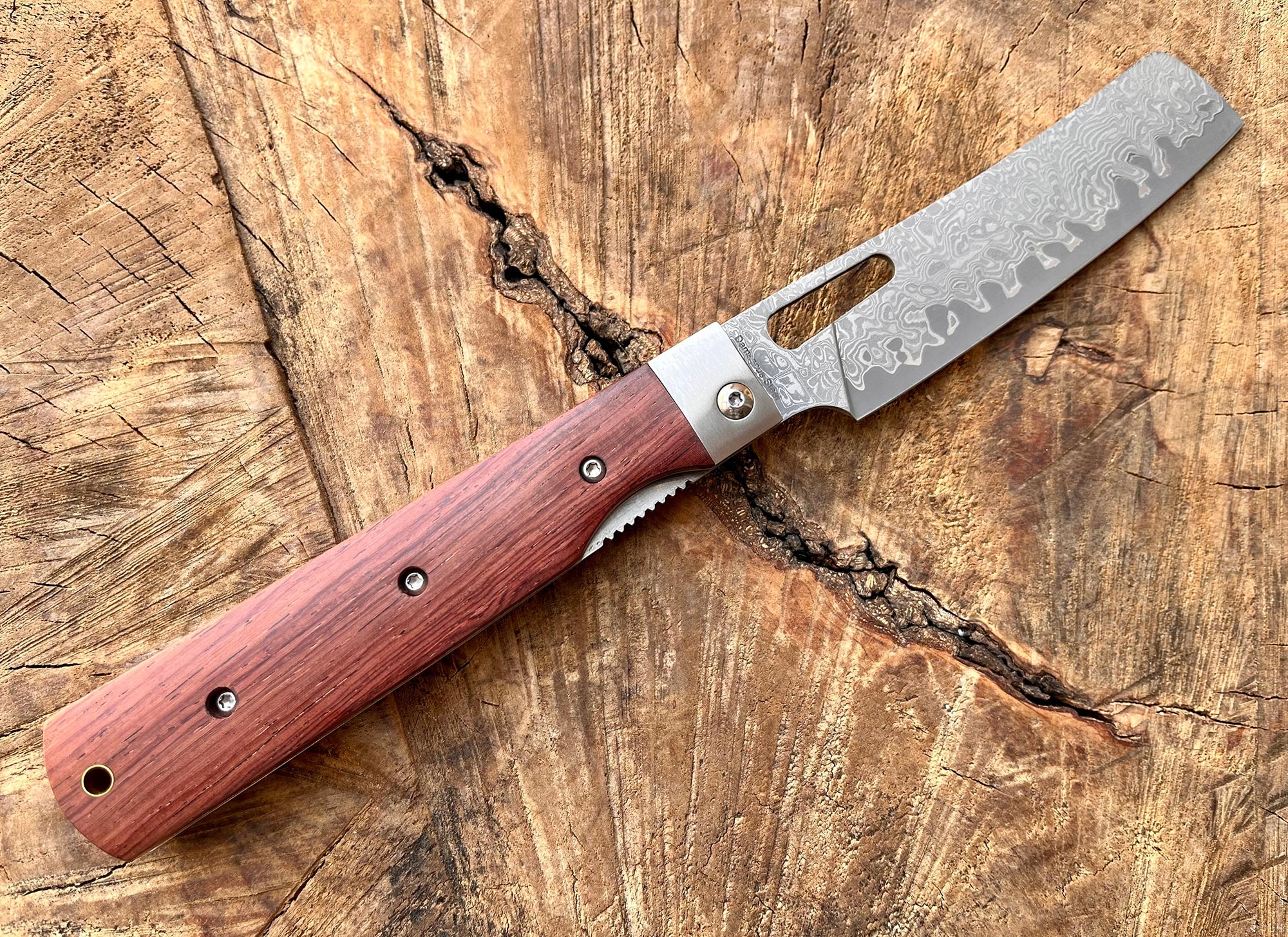 Charakteristisch für das GA002D ist seine besondere Konstruktion: Es handelt sich um ein klappbares Kochmesser, das die Leistung eines klassischen japanischen Küchenmessers mit der Mobilität eines Taschenmessers kombiniert. Die etwa 11 cm lange Klinge besteht aus mehrlagigem Damaststahl, der nicht nur durch seine markante Maserung besticht, sondern auch für hohe Schnitthaltigkeit und Präzision sorgt.