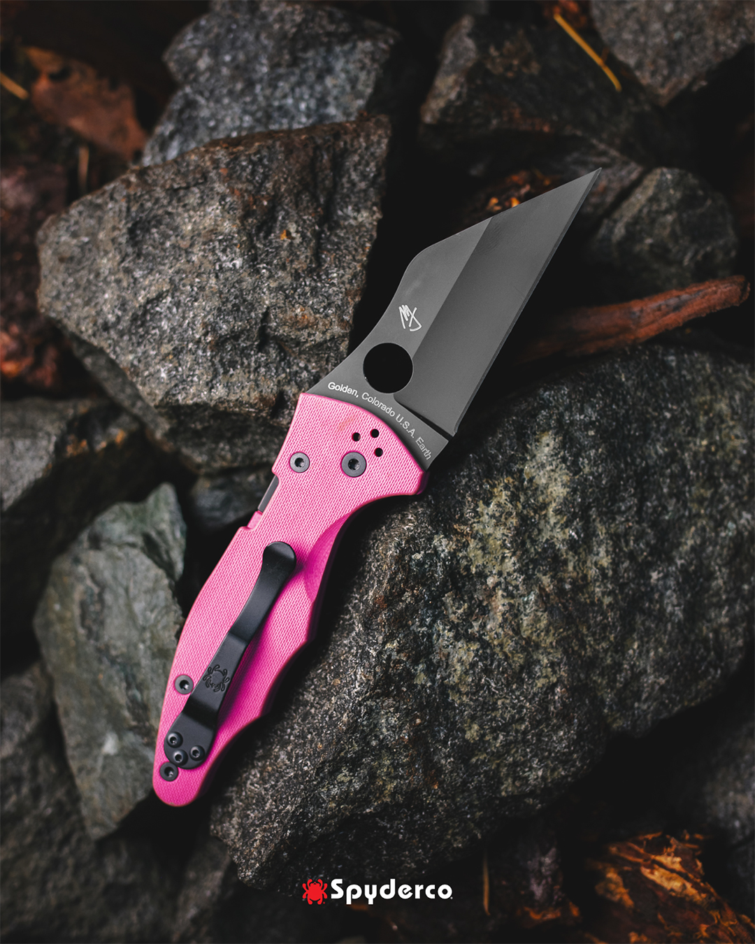 Bei dieser limitierten Auflage ist die Klinge aus CPM® S30V® mit einer schwarzen DLC-Beschichtung (Diamond-Like Carbon) überzogen und mit einem Griff aus pinken G-10-Schalen mit Peel-Ply-Struktur kombiniert. Um das Design abzurunden, ist auch der Liner, der Clip und die Schrauben schwarz beschichtet.