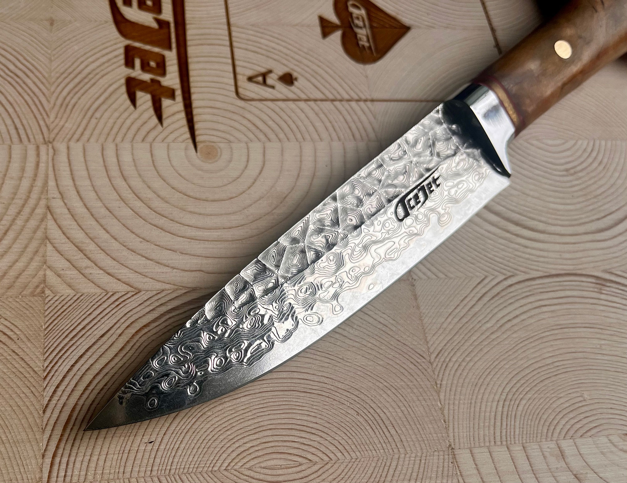 AceJet setzt seine Tradition für höchste Qualität fort und präsentiert das Hammerman Olive SanMai Küchenmesser. Gefertigt aus japanischem SanMai Damaststahl mit einem mittleren Schneidkern aus VG-10 Stahl, vereint dieses Messer maximale Schneidleistung mit ästhetischem Design - vergleichbar mit den Spitzenprodukten renommierter Hersteller aus Solingen.