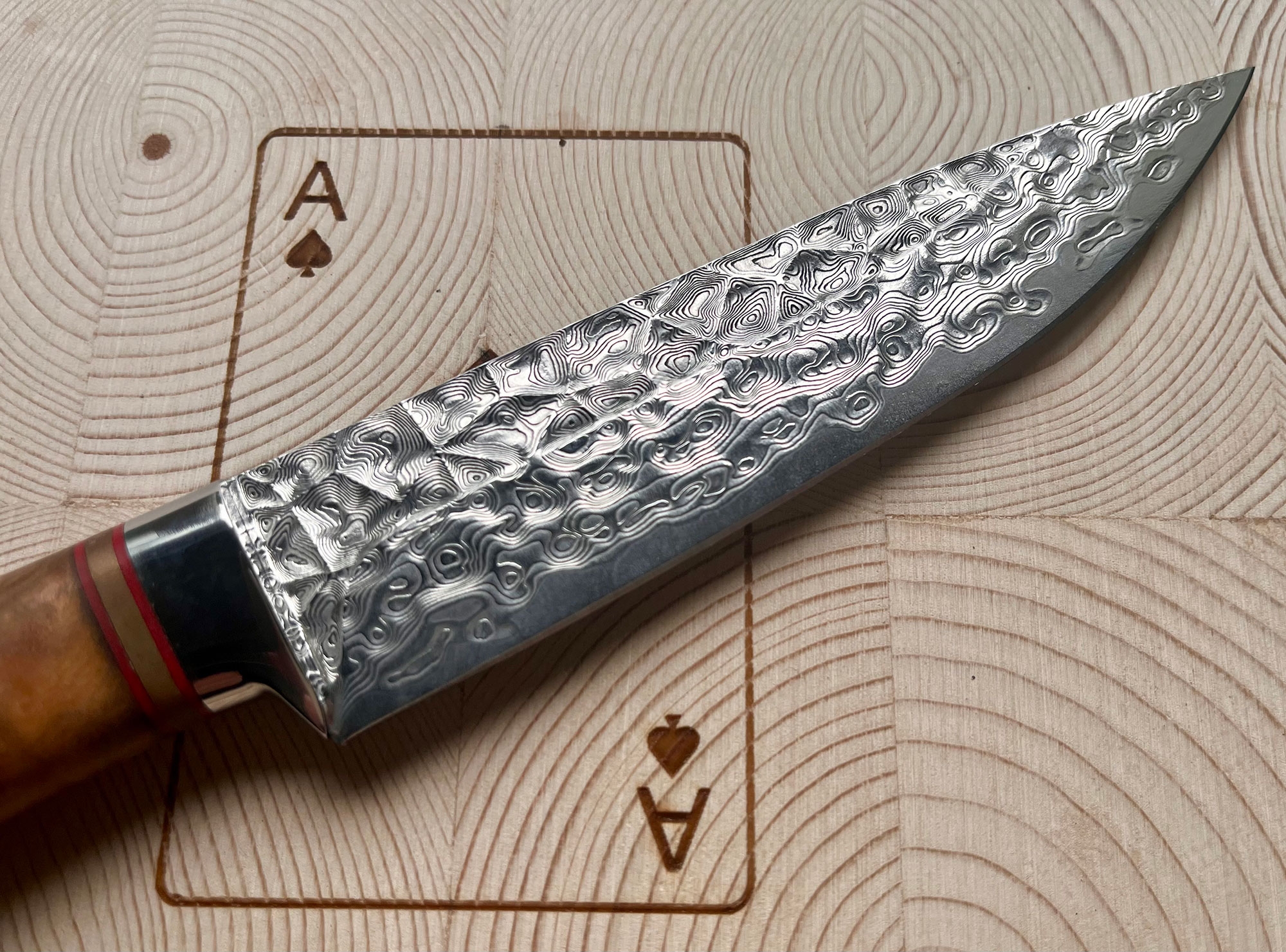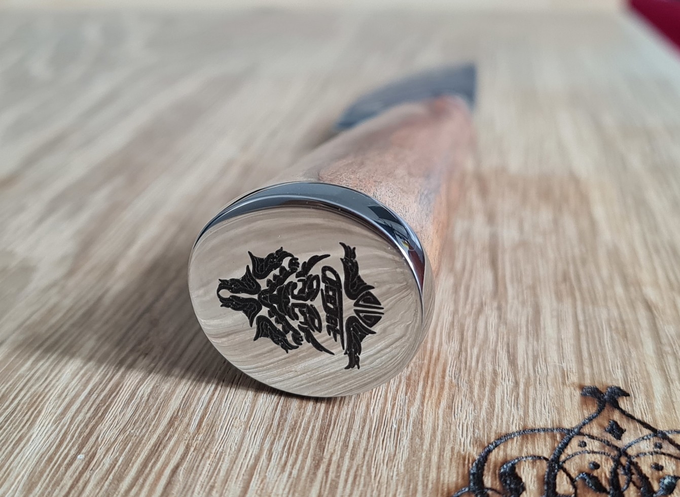 · Doppelseitige Damastklinge mit mittlerem Schneidkern („Razor Layer") für langanhaltende Schärfe und Präzision.